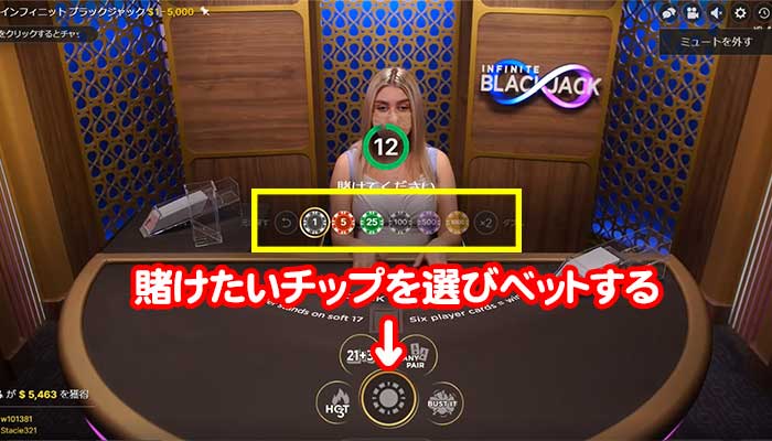 では、実際にライブカジノで行われているインフィニットブラックジャックがどのように進行していくかをみてみましょう。