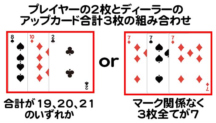 最初に配られたプレイヤーの2枚のカードとディーラーのアップカード(表向きに置かれているカード)の合計が19点、20点、21点、7-7-7(マーク関係なく3枚全て7)のいずれかに該当すると予想して賭ける。