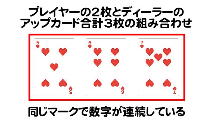「♠5」「♣6」「♥7」このようにマーク(絵柄)は関係なく数字が連続している場合、配当は10倍