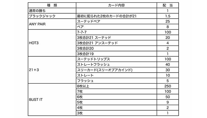 ディーラがバーストするまでに引いたカードの枚数によって配当が変わります。