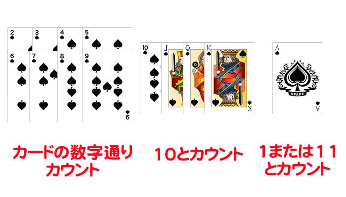 ブラックジャックのルールはプレイヤーとディーラーそれぞれに配られたカードの合計が「21」を超えない範囲でより「21」に近い方が勝ちとなります。