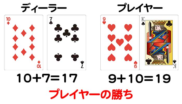 ディーラー17点、プレイヤー19点でプレイヤーの勝ちとなります。