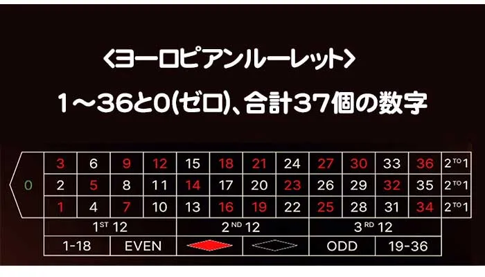 ヨーロピアンルーレットとは1~36と0(ゼロ)、合計37個の数字のルーレットです。