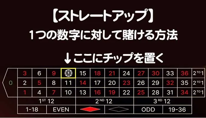 1つの数字に対して賭ける方法です。賭けたい数字の上にチップを置きます。