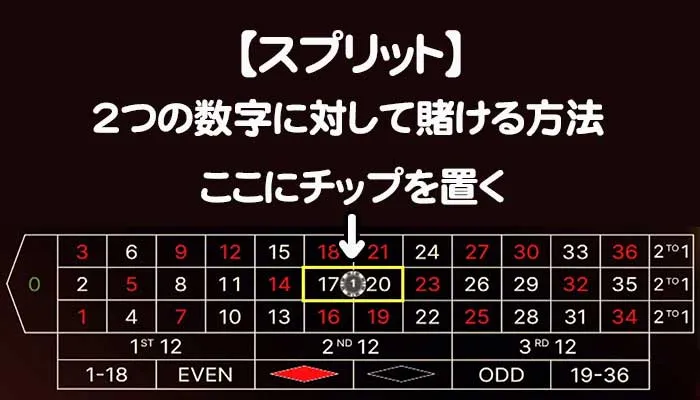 縦、横に並ぶ2つの数字に対して賭ける方法です。数字と数字の真ん中にチップを置きます。