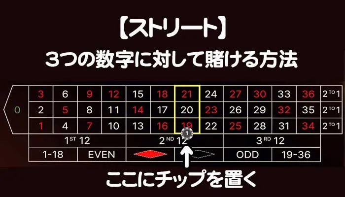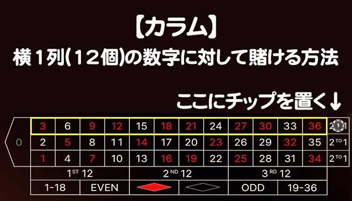 縦に並んだ3つの数字の列に対して賭ける方法です。1番下の数字の下にチップを置きます。
