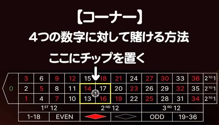 四角に並ぶ4つの数字に対して賭ける方法です。4つの数字の真ん中にチップを置きます。