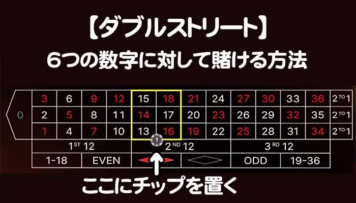 縦に並んだ3つの数字2列に対して賭ける方法です。1番下の数字と数字の下の線の真ん中にチップを置きます。