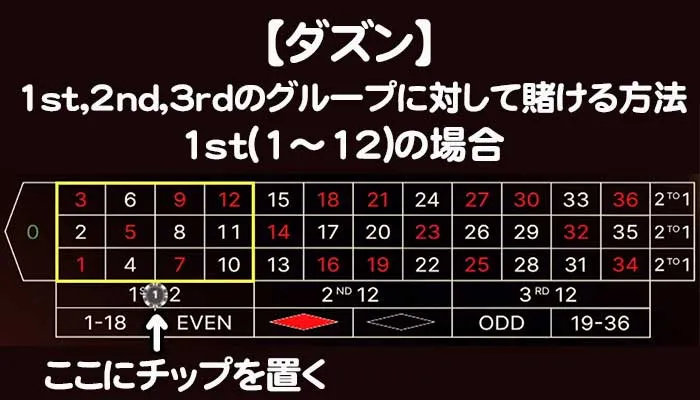 1~12(1st)、13~24(2nd)、25~36(3rd)と分かれているグループに対して賭ける方法です。賭けたいグループのベッティングエリアにチップを置きます。