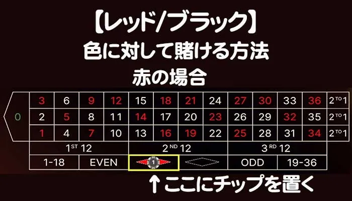 レッドとブラックに分かれている色のグループに対して賭ける方法です。賭けたいグループのベッティングエリアにチップを置きます。