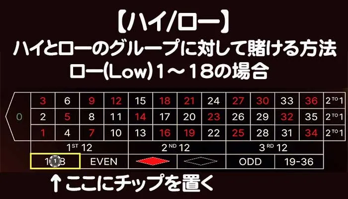 ハイ(High)19~36までの数字、ロー(Low)1~18までの数字、と分かれているグループに対して賭ける方法です。賭けたいグループのベッティングエリアにチップを置きます。