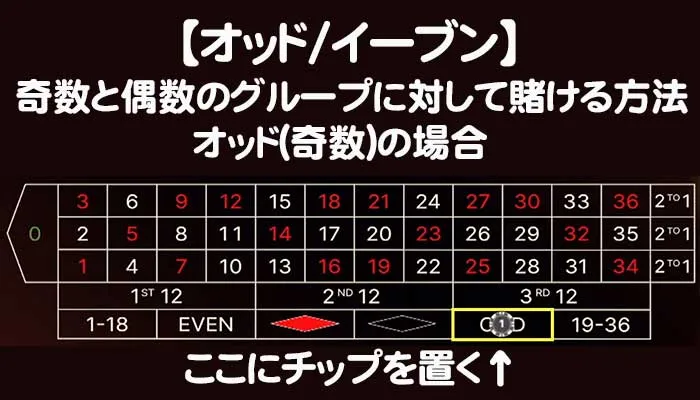 オッド(奇数)、イーブン(偶数)で分かれているグループに対して賭ける方法です。賭けたいグループのベッティングエリアにチップを置きます。