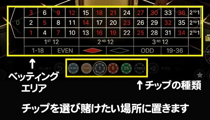 まずは賭けたいチップを選びベッティングエリアにチップを置きます。