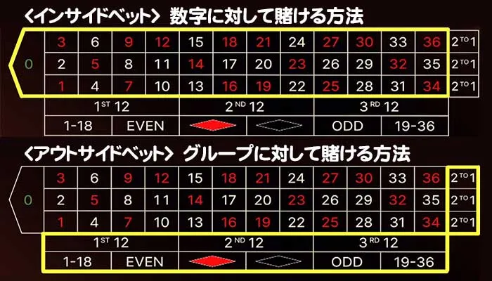 賭ける方法はインサイドベットといって数字に対して賭ける方法とアウトサイドベットといってグループに対して賭ける方法があります。