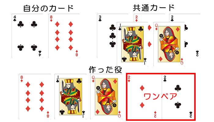 共通カードに2のワンペアがあるので2のワンペアを使います。