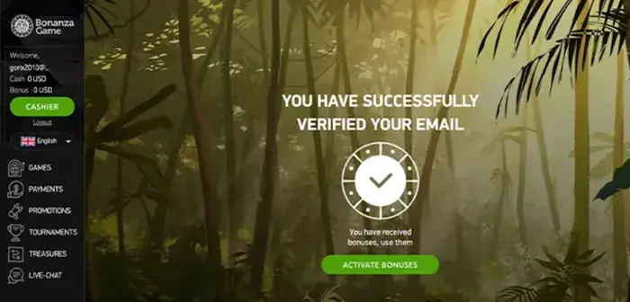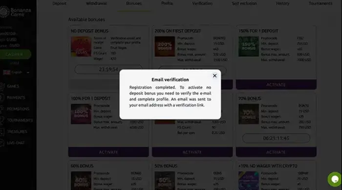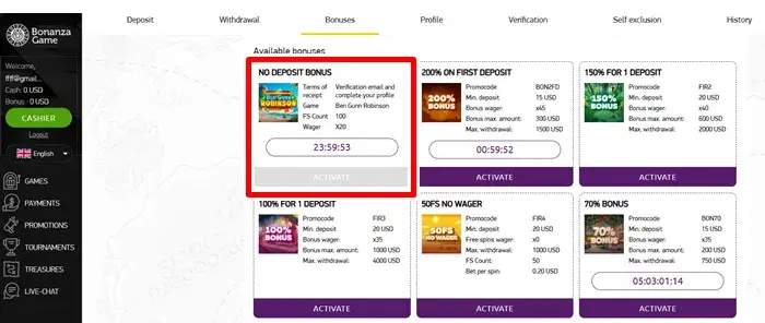 また、ボナンザゲームのアカウント登録後、24時間以内に入金不要ボーナスを有効化する必要もあります。
