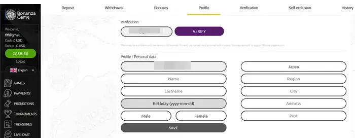 ボナンザゲームの入金不要ボーナスは、当サイトの専用リンクから新規無料登録してプロフィール(個人情報)の入力が完了すれば貰えるボーナスです。