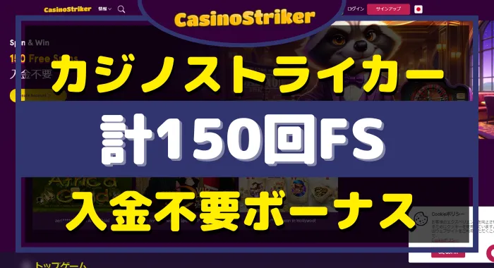カジノストライカーに初めて登録するともらえる入金不要ボーナス【合計FS150回】の出金条件や受け取り方などについてわかりやすく解説します。