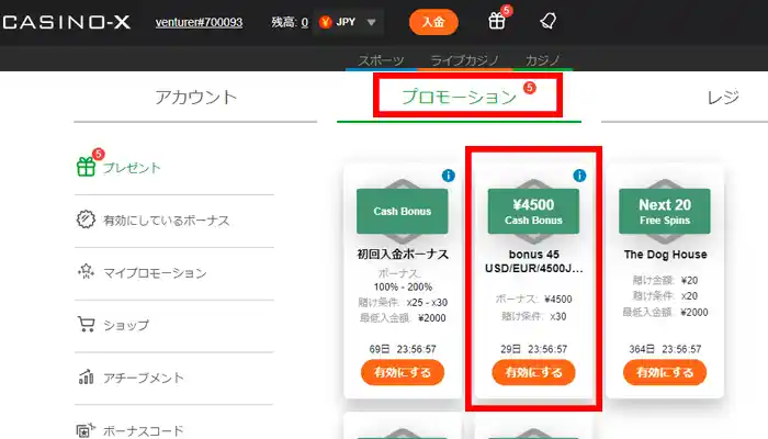 認証完了後、プロモーションより入金不要ボーナスを有効にすれば完了です。