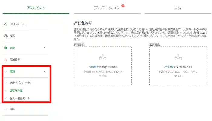 アカウント⇛認証⇛書類より本人確認書類の提出を行います。