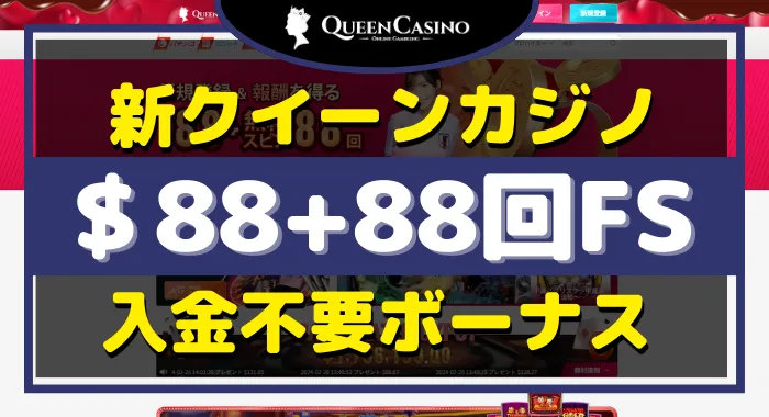 新クイーンカジノの入金不要ボーナスは最大$88+最大フリースピン88回貰えるボーナスです。