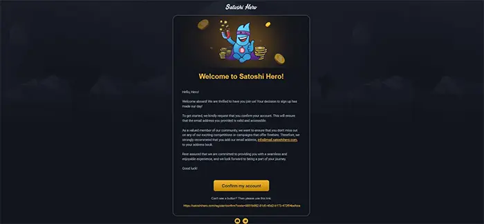 登録したメールアドレスにサトシヒーローから認証メールが届くので【Confirm my account】をクリックして認証を完了しましょう。